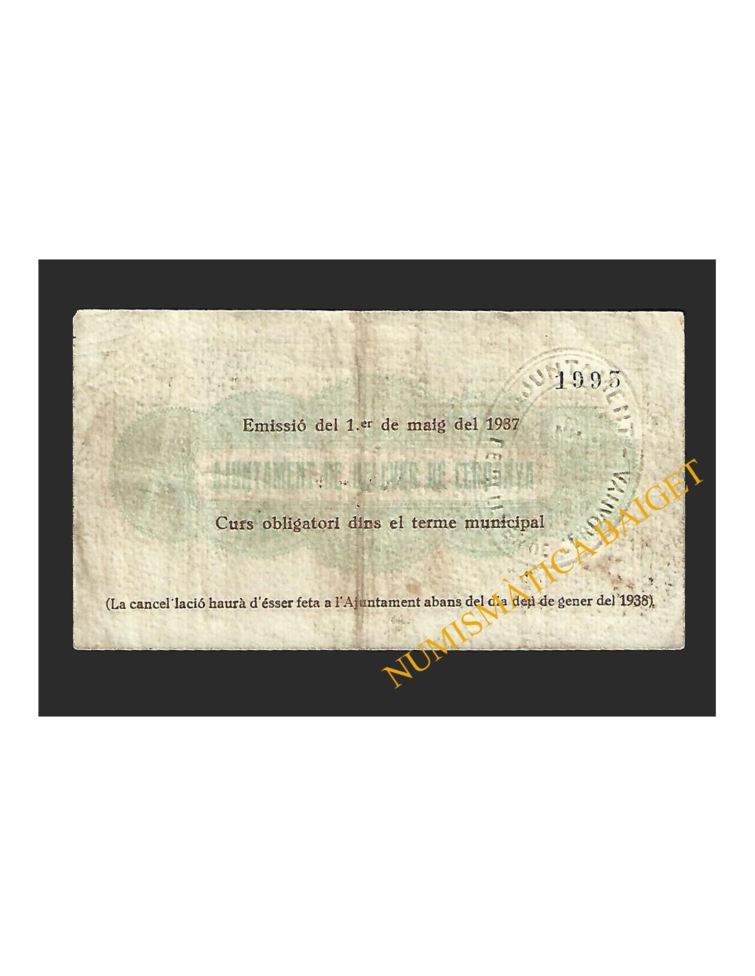 Billetes Locales Guerra Civil CATALUÑA y ANDORRA MONTBRIO DEL CAMP (Tarragona), 0'50 pessetes, 25 de maig del 1937 Montbrió del Camp (Tarragona) 0'50 pessetes BL-0584 90,00 € Montbrió del Camp (Tarragona) 0'50 pessetes Añadir al carrito