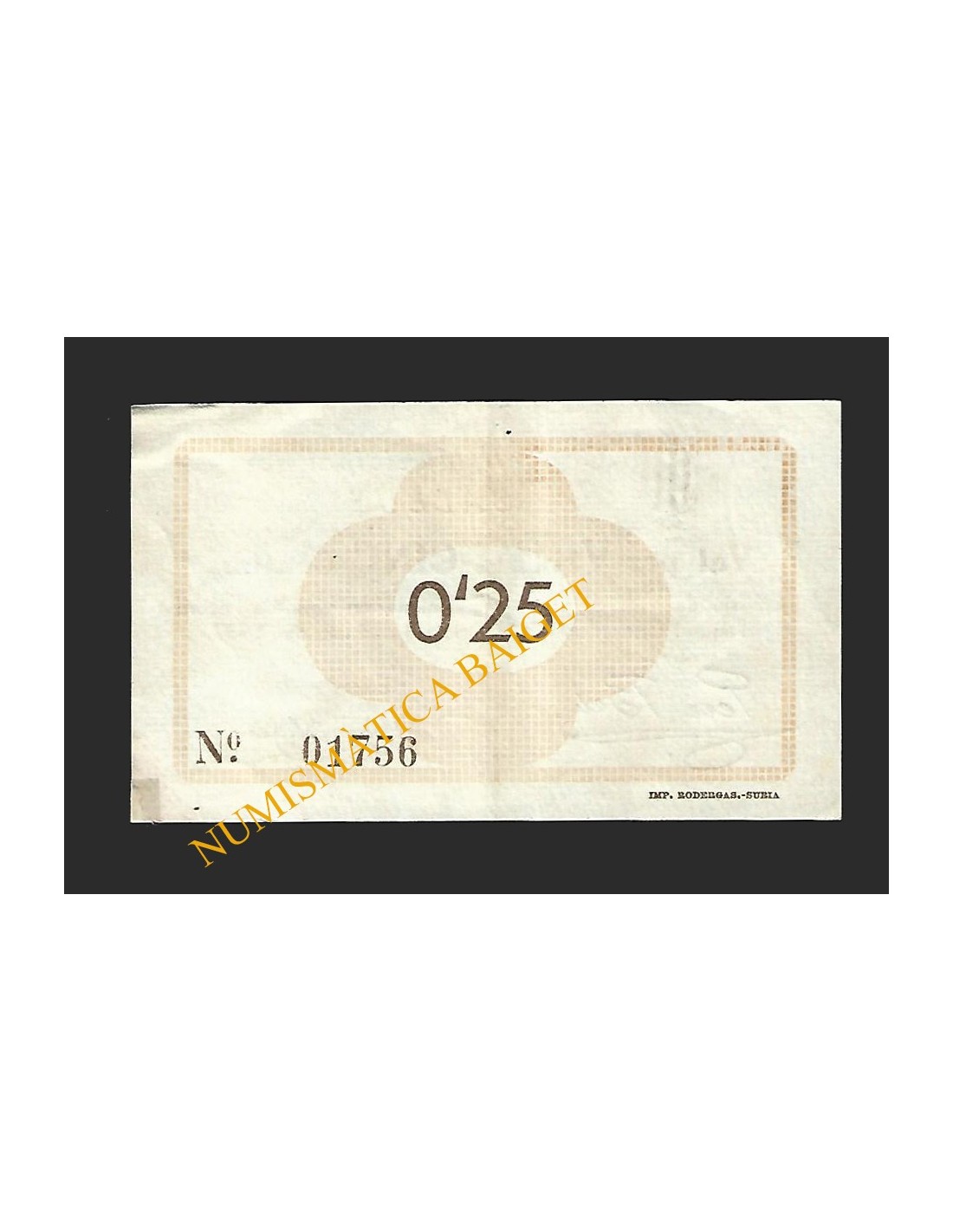 Billetes Locales Guerra Civil CATALUÑA y ANDORRA MONTCADA I REIXAC (Barcelona), 25 centims, maig del 1937 Montcada i Reixac (Barcelona) 25 centims BL-0590 20,00 € Montcada i Reixac (Barcelona) 25 centims Añadir al carrito