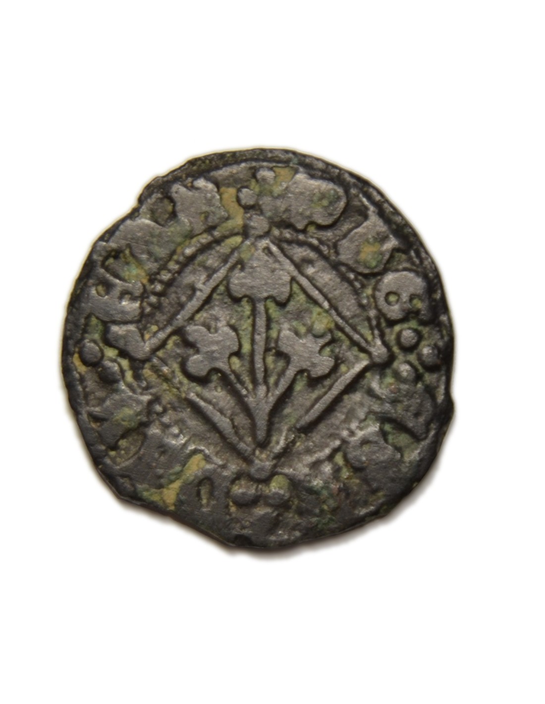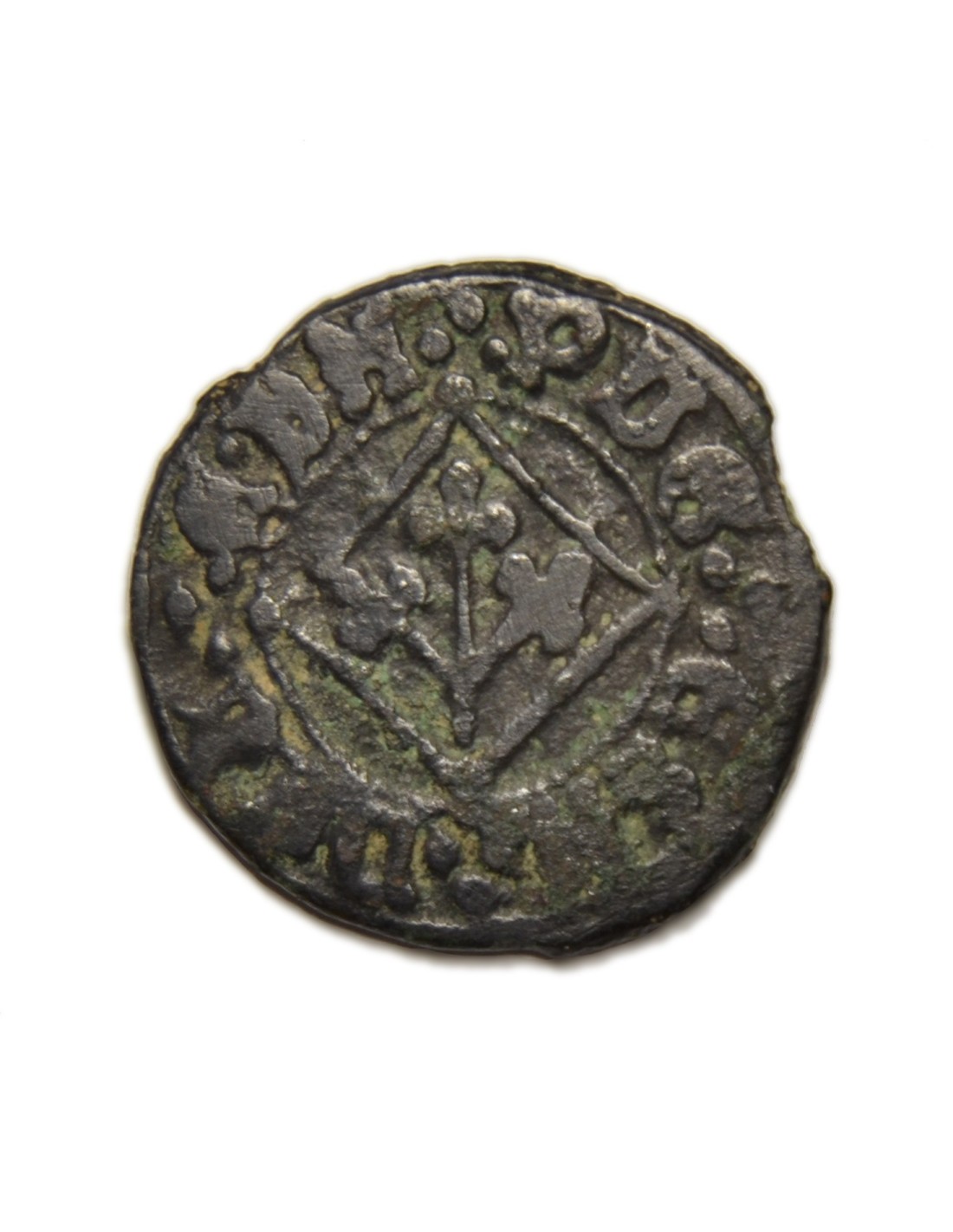 A/ Triple lirio dentro de cuadro ajedrezado girado, a su alrededor con letras góticas y mayúsculas .·.PUG.·.ESA.·.DEL.·.EDA.·. Orla de puntos.R/ Triple lirio dentro de cuadro ajedrezado girado, a su alrededor con letras góticas y mayúsculas .·.PUG.·.ESA.·.DEL.·.EDA.·. Orla de puntos.