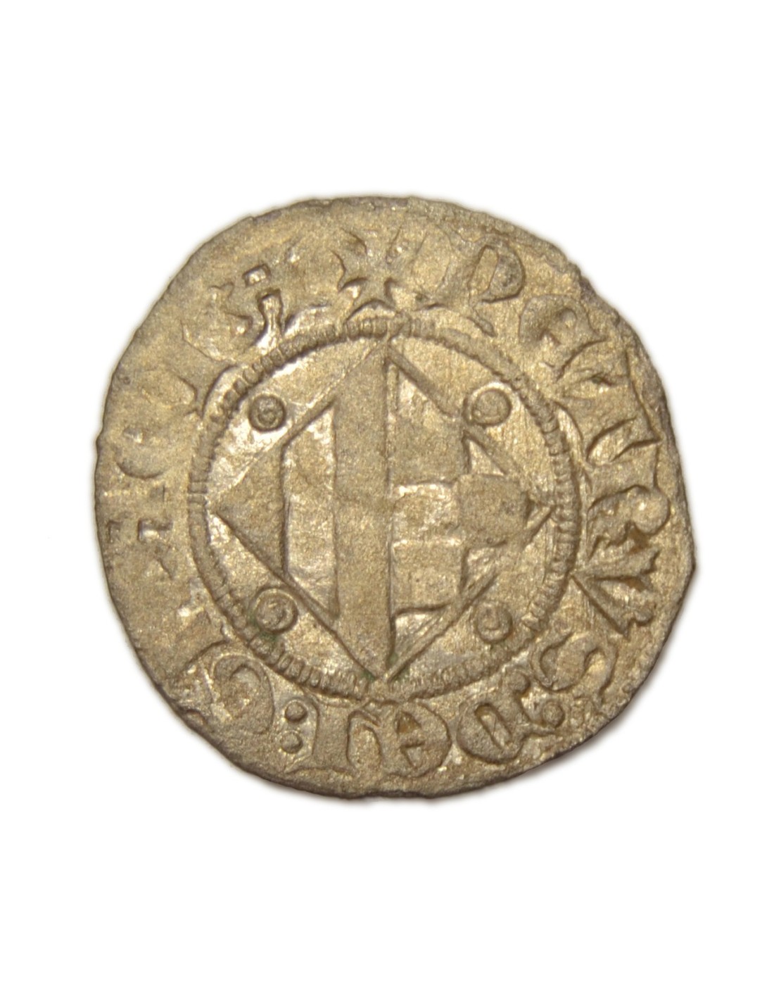 A/ Escudo con rombo partido con escudo de armas de Catalunya-Urgell, con anillos en espacios, a su alrededor: +PETRVS : DEI : GRACIA.