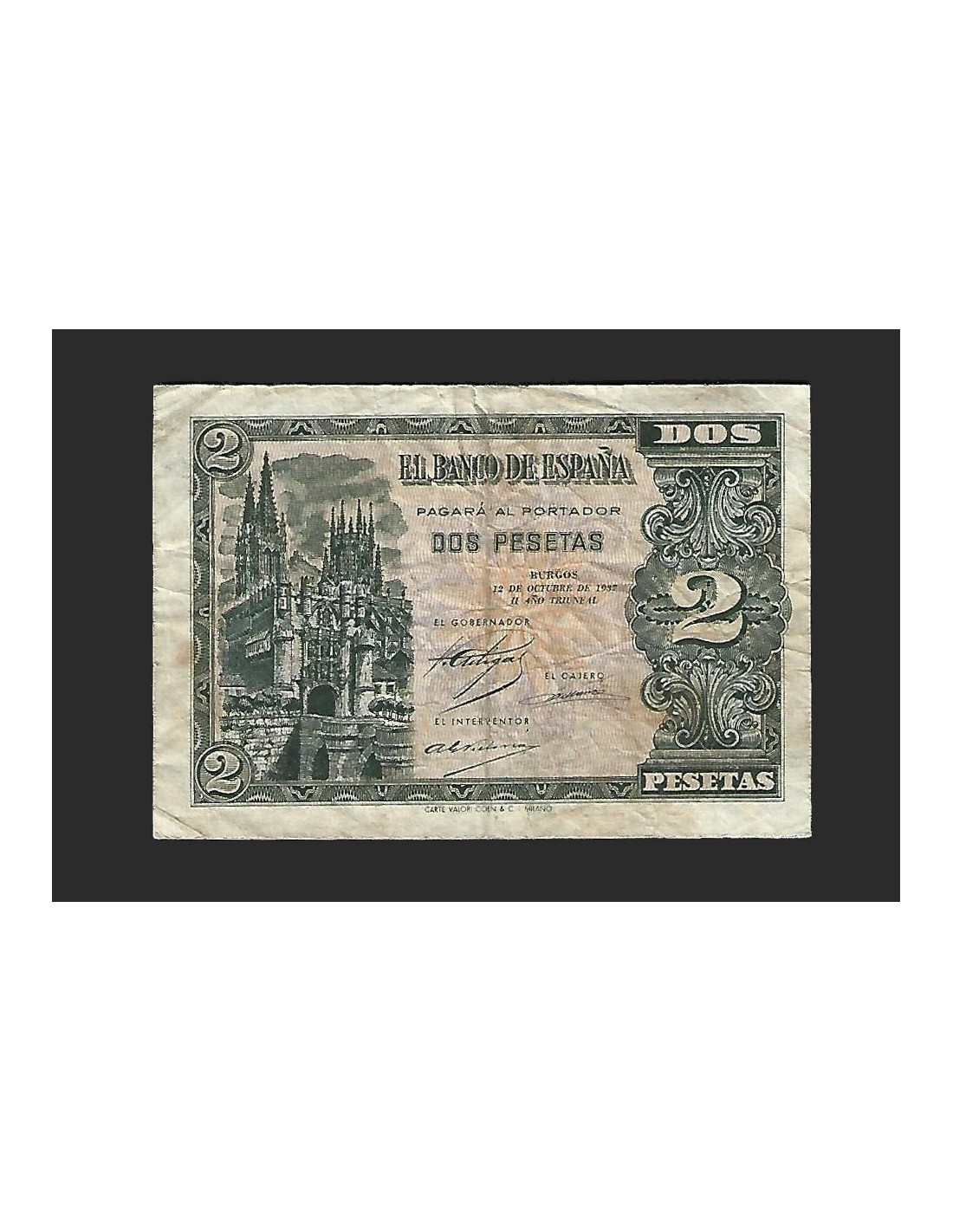 Emisión: Burgos 12 de octubre de 1937. Serie: B, Numeración: 3454265