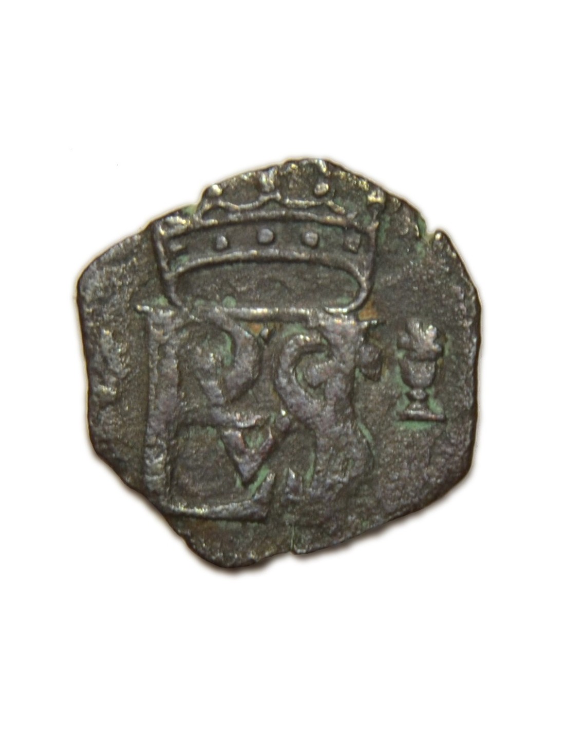 Peso: 0,59 grs. Metal: CU. Catálogo: C3-815 Conservación: BC Ceca: Cuenca. Ensayador: Cruz Patriarcal - Cáliz coronado de estrella en anverso. Observaciones: leyendas de ambas caras practicamente no legibles, y en reverso C - Cruz patriarcal. Bonita.