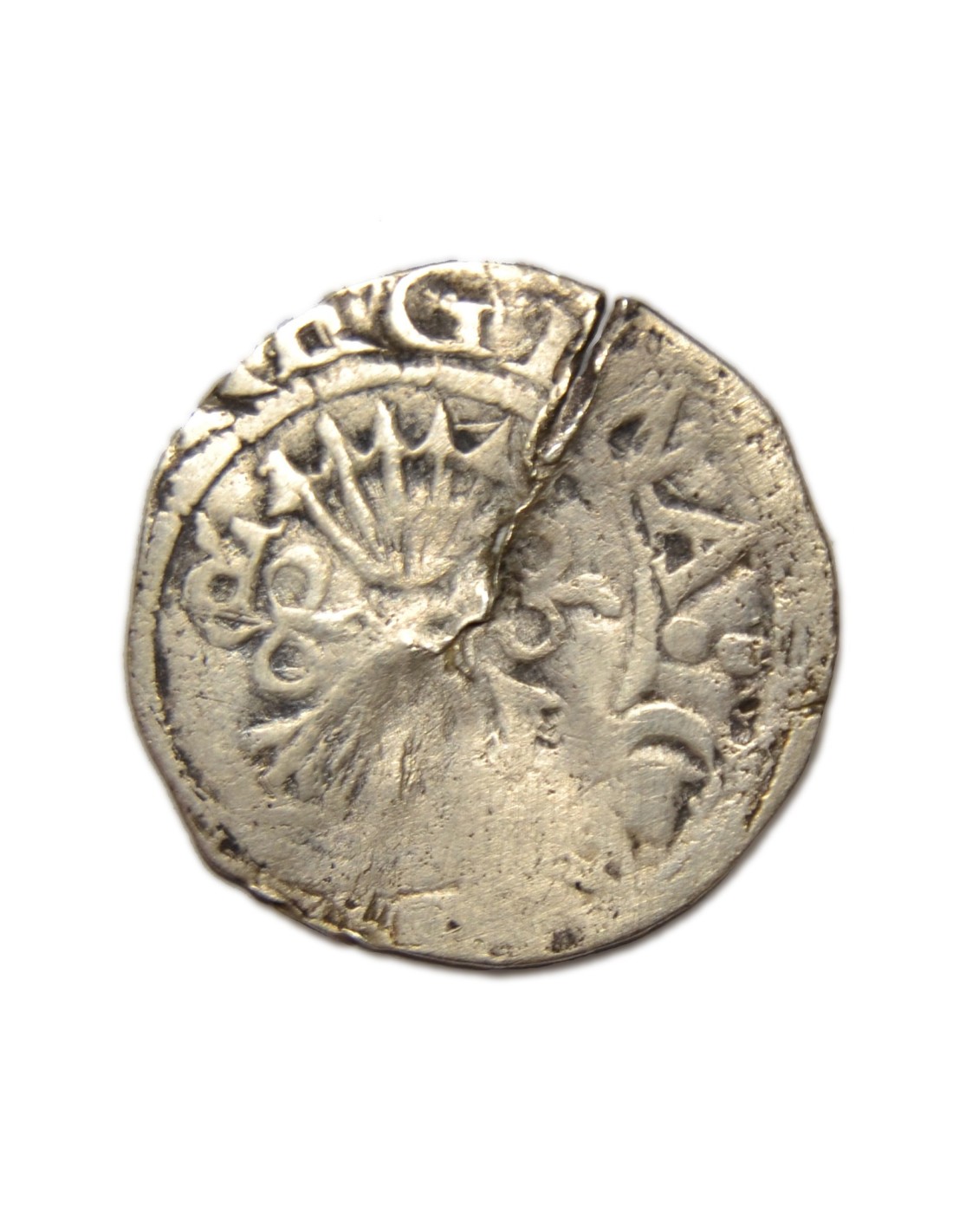 Peso: 1,48 grs. Metal: AR. Catálogo: C3-449 Conservación: BC-. Ceca: Granada. Observaciones: Leyendas de anverso y reverso visibles parcialmente con cierta dificultad. Algo recortada y rotura de cuño longitudinal sin partición total.