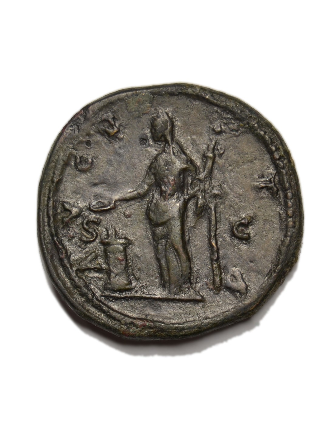 R/ Vesta a la izquierda, portando pátera y paladión: altar a sus pies; a su alrededor: AVGVSTA. S. C.
