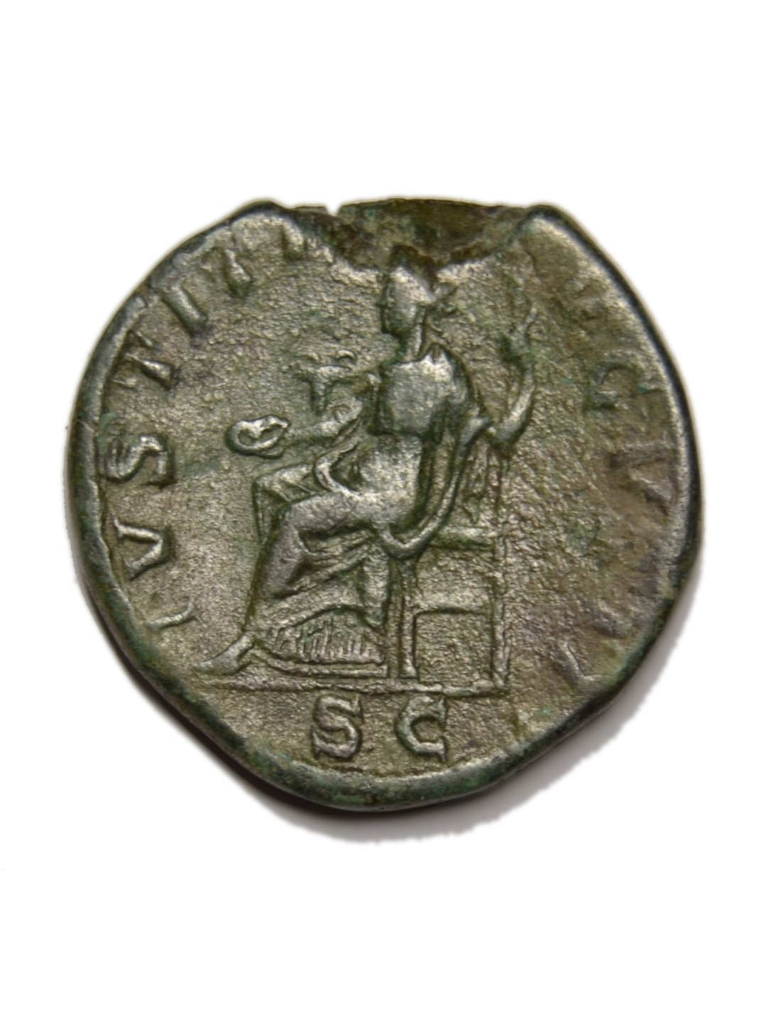 R/ Justicia entronizada portando pátera y cetro, a su alrededor: IVSTITIA. AVGVSTI. S. C.