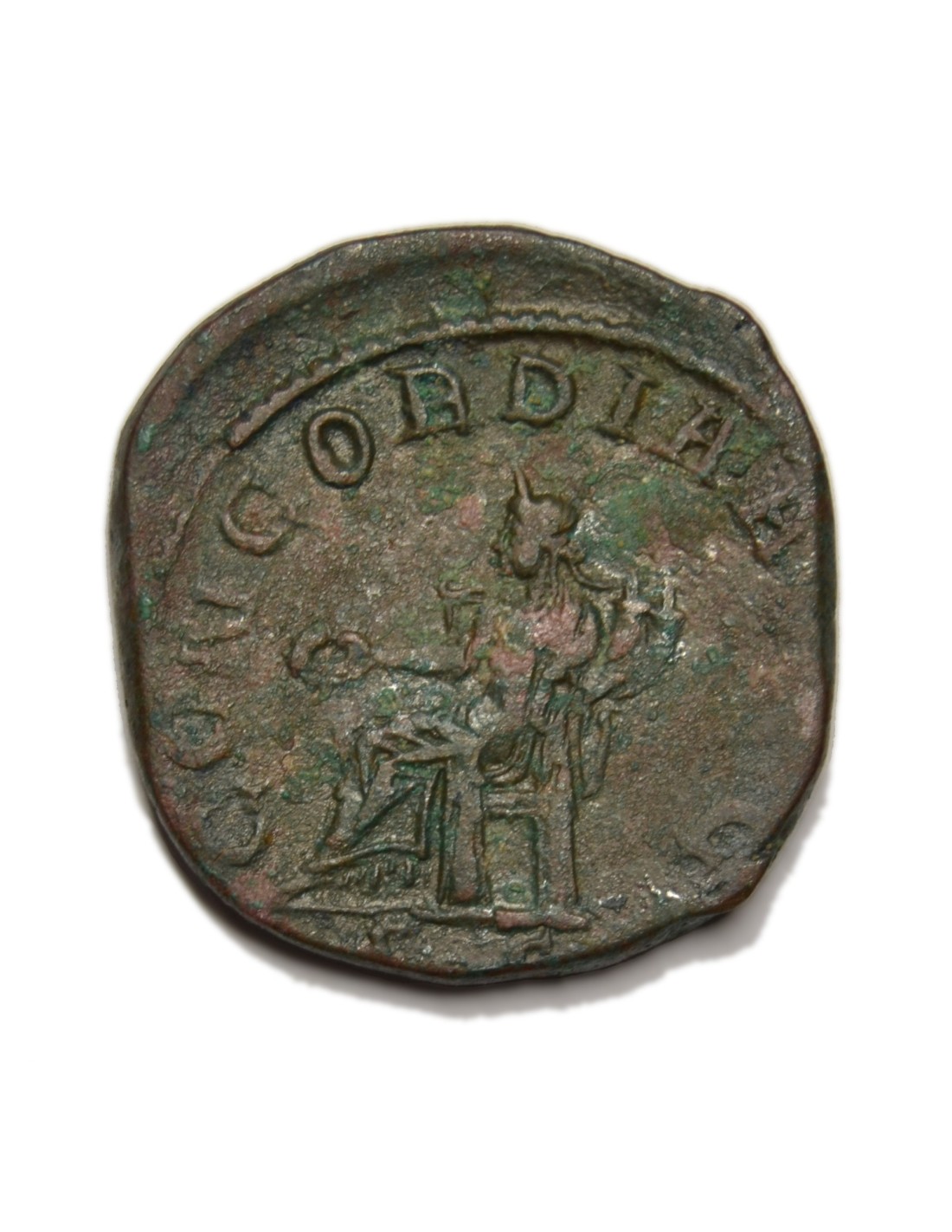 R/ Concordia sedente a la izquierda, portando pátera y doble cornucopia, a su alrededor: CONCORDIA, (AVV)G. S. C.