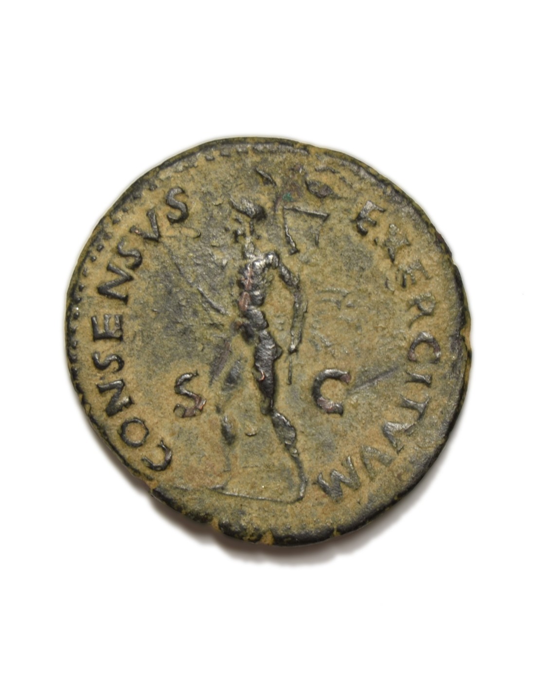 R/Marte con casco y vestido solo con manto en marcha a la izquierda portando lanza en su mano derecha y aquila y vexilllum en la izquierda. A su alrededor leyenda: CONSENSVS EXERCITVVM S C