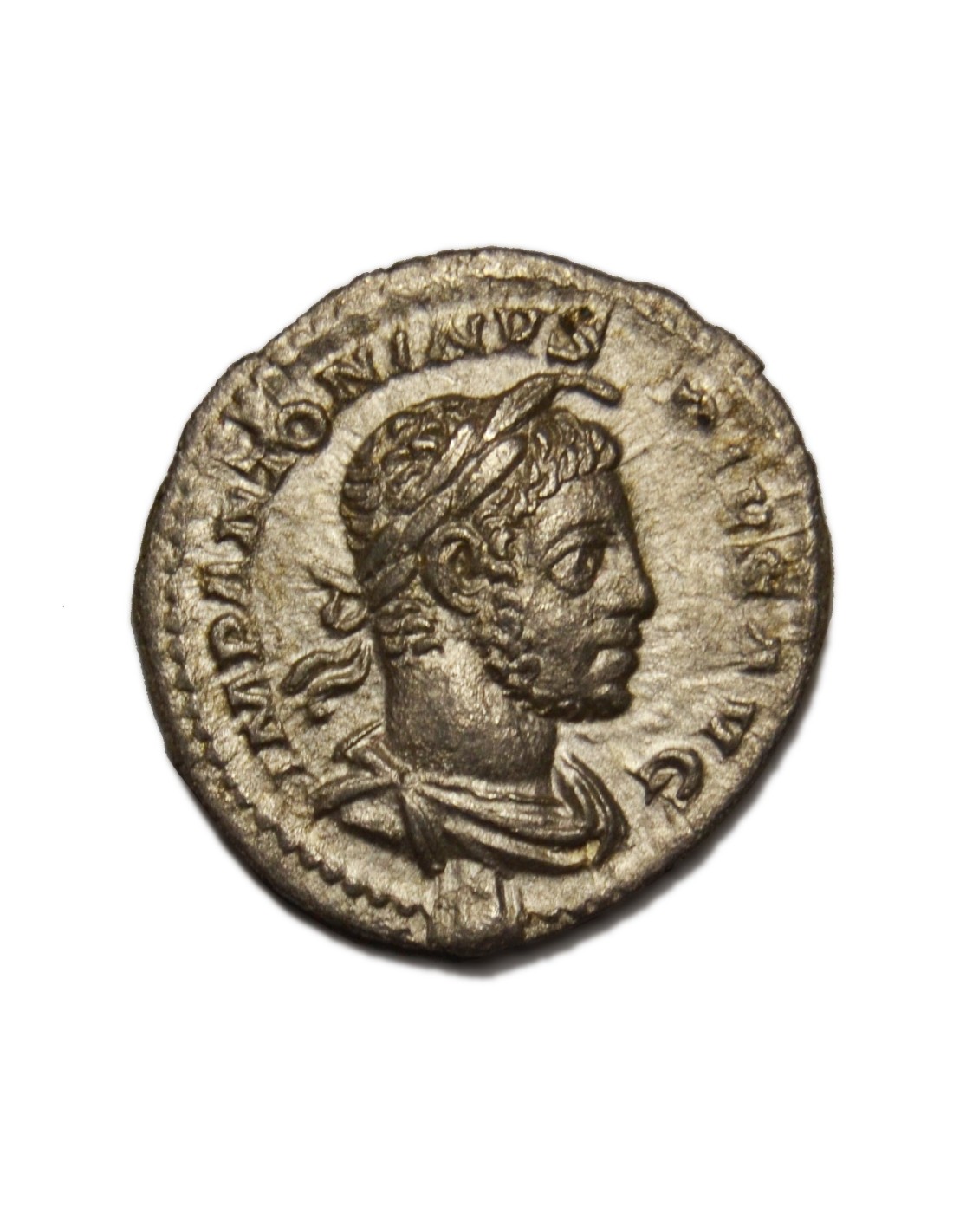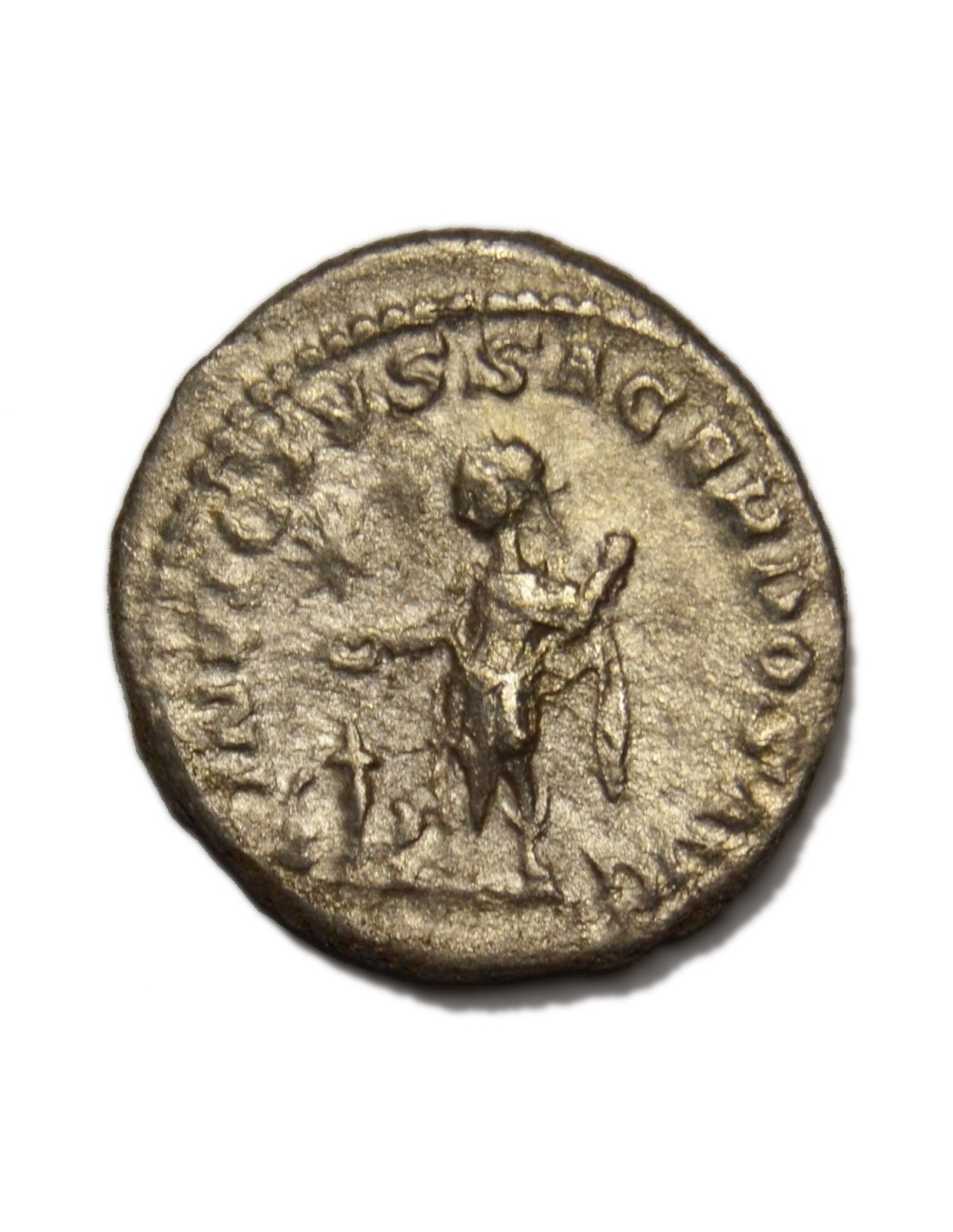R/ Heliogábalo de pie, de frente y con la cabeza a izquierda portando pátera y garrote, toro yacente detrás del altar y estrella en el campo a la izquierda, a a su alrededor: INVICTVS SACERDOS AVG