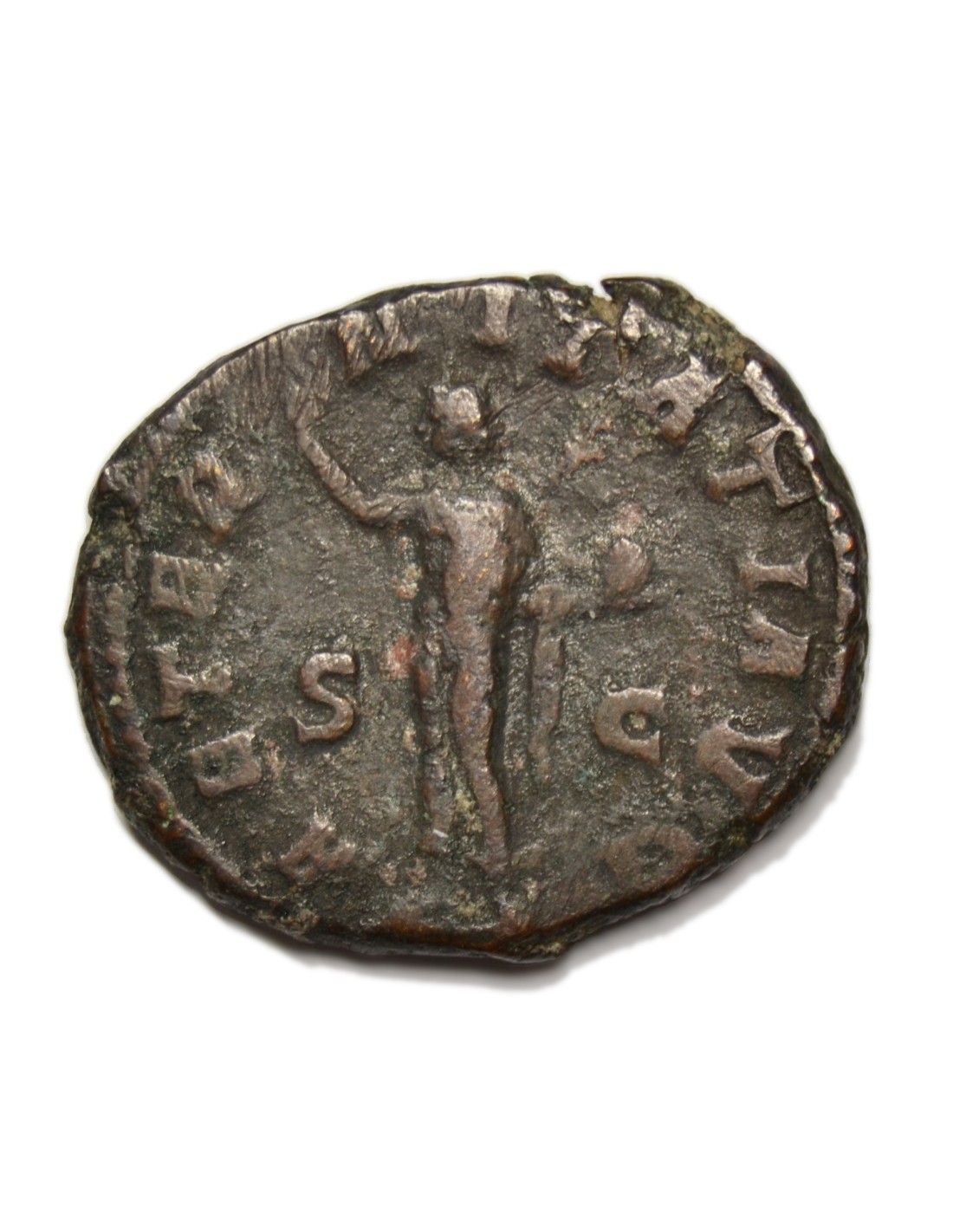 R/ Sol desnudo parcialmente de frente con cabeza a la izquierda, levantando la mano derecha y sosteniendo un globo terráqueo con la izquierda a su alrededor: AETERNITAS AVG. S. C.