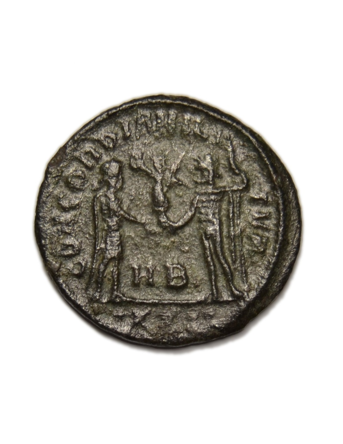 R/ Diocleciano estante, frente a Júpiter, quien le hace donación de un globo rematado por la Victoria. entre ellos H B, a su alrededor leyenda: CONCORDIA MILITVM