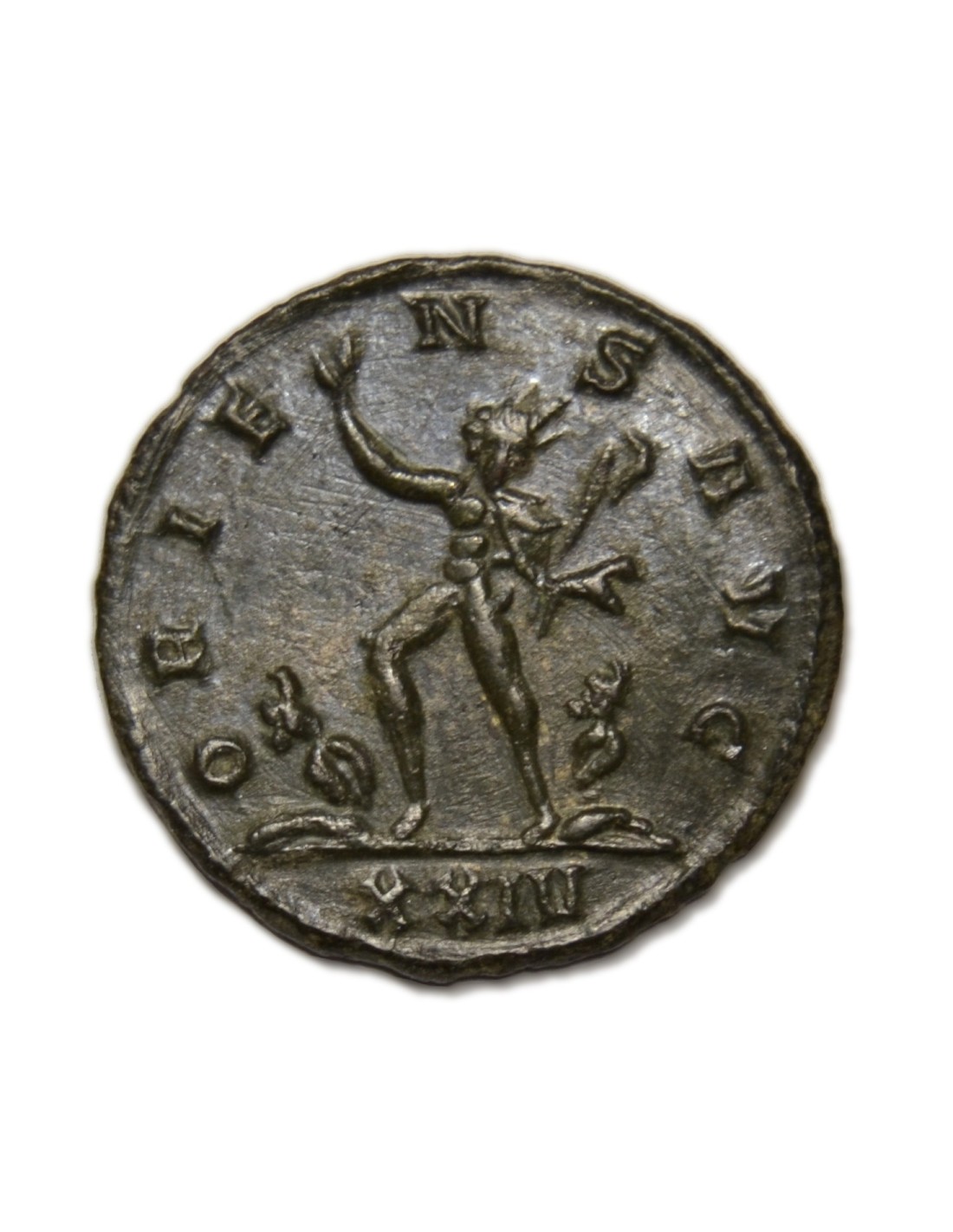 R/ Sol radiado, de pie a la izquierda levantado la mano derecha y sosteniendo un látigo con la izquierda, dos cautivos uno a cada lado, a su alrededor: ORIENS AVG., en exergo: XX I V