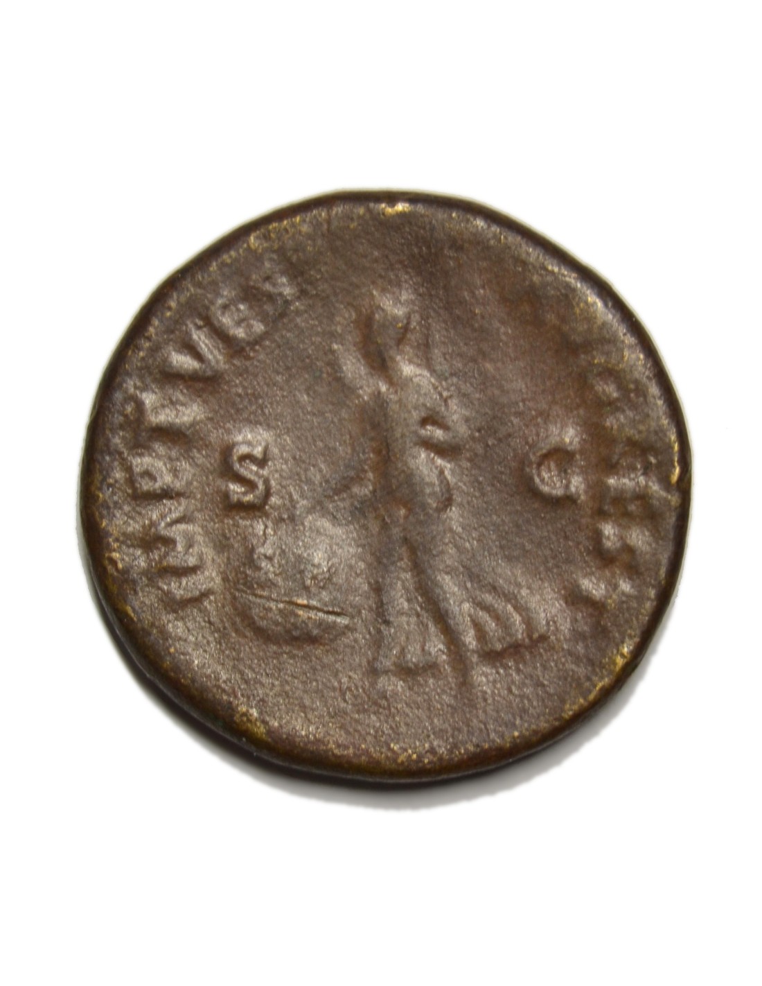 R/ Victoria drapeada a la izquierda sujetando con su mano derecha escudo con la inscripción: S.P.Q.R. a su alrededor la leyenda: IMP. T. VESP. AVG. REST. S.C.