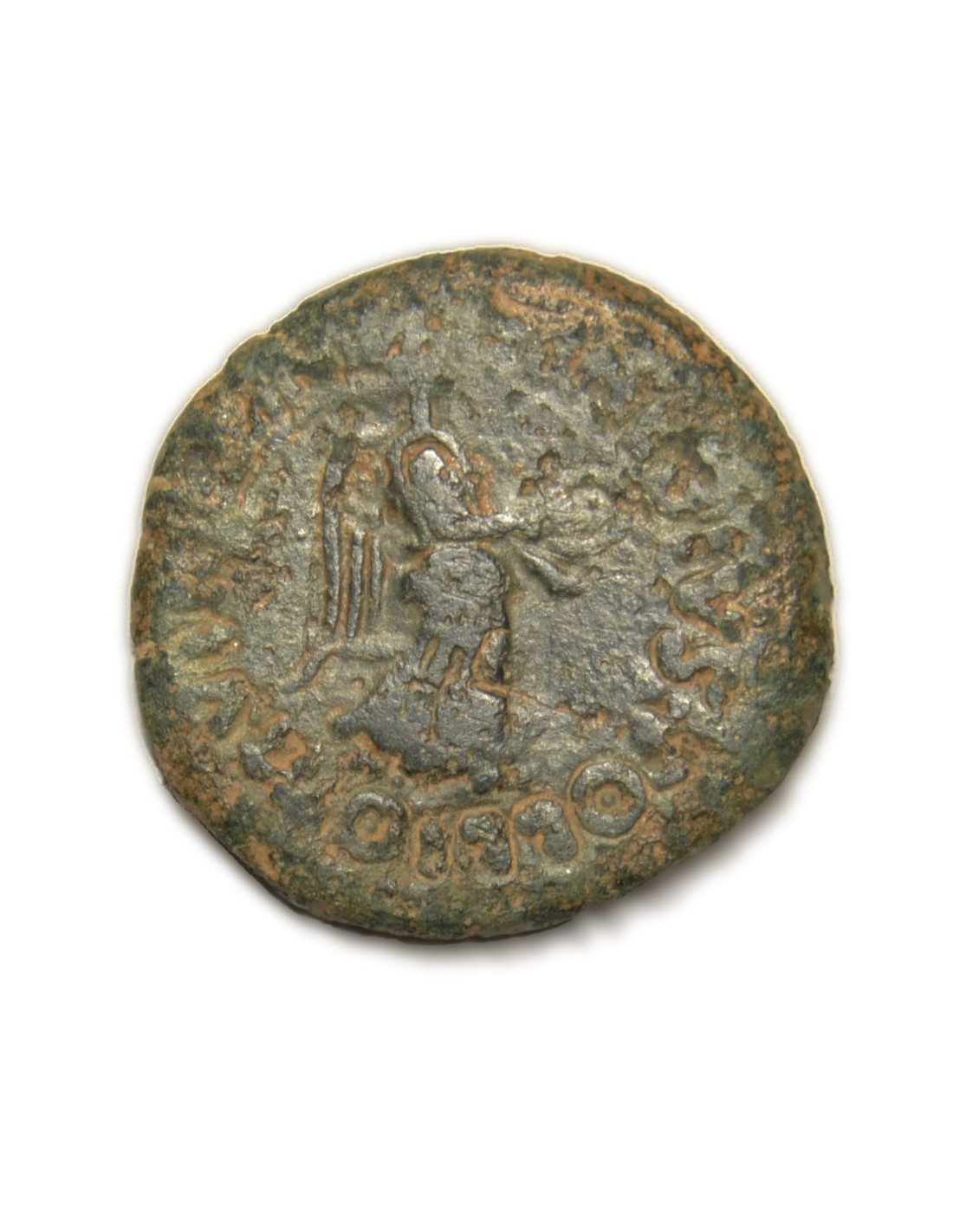 A/ Victoria en marcha a la derecha llevando una corona y una palma, a su alrededor leyenda latina: P. BAEBIVS POLLIO IIVIR QVIN.