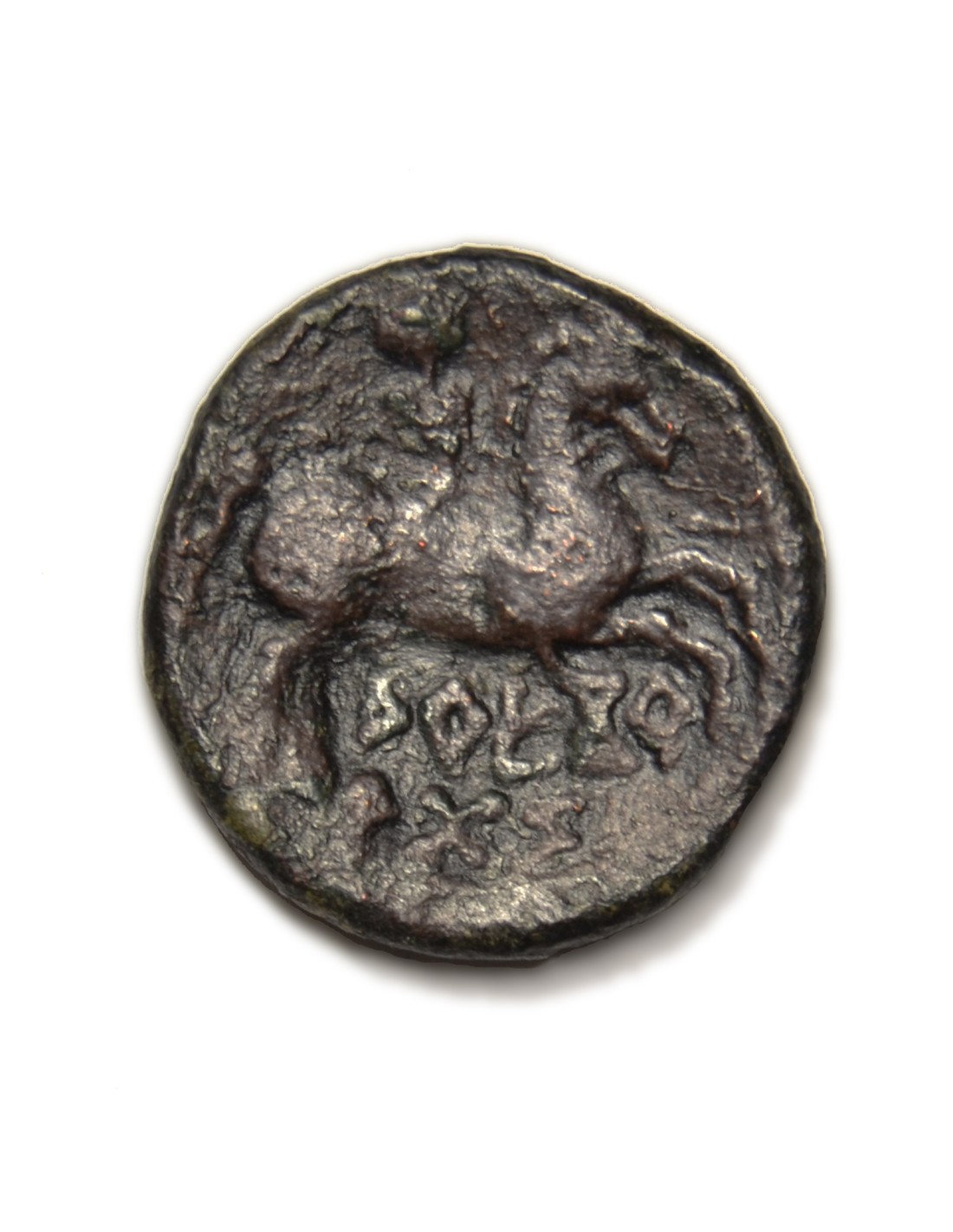 R/ Jinete lancero cabalgando a la derecha, debajo inscripción ibérica en dos líneas AREKOR-ATAS.