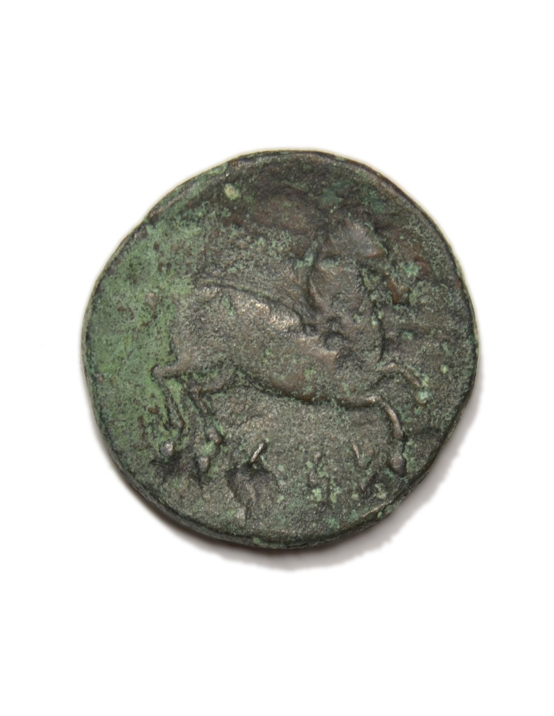 R/ Caballo al galope a la derecha; debajo inscripción ibérica KESE.