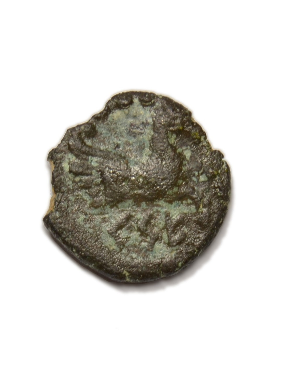 R/ Medio Pegaso a la derecha, encima tres glóbulos; debajo inscripción ibérica KESE.