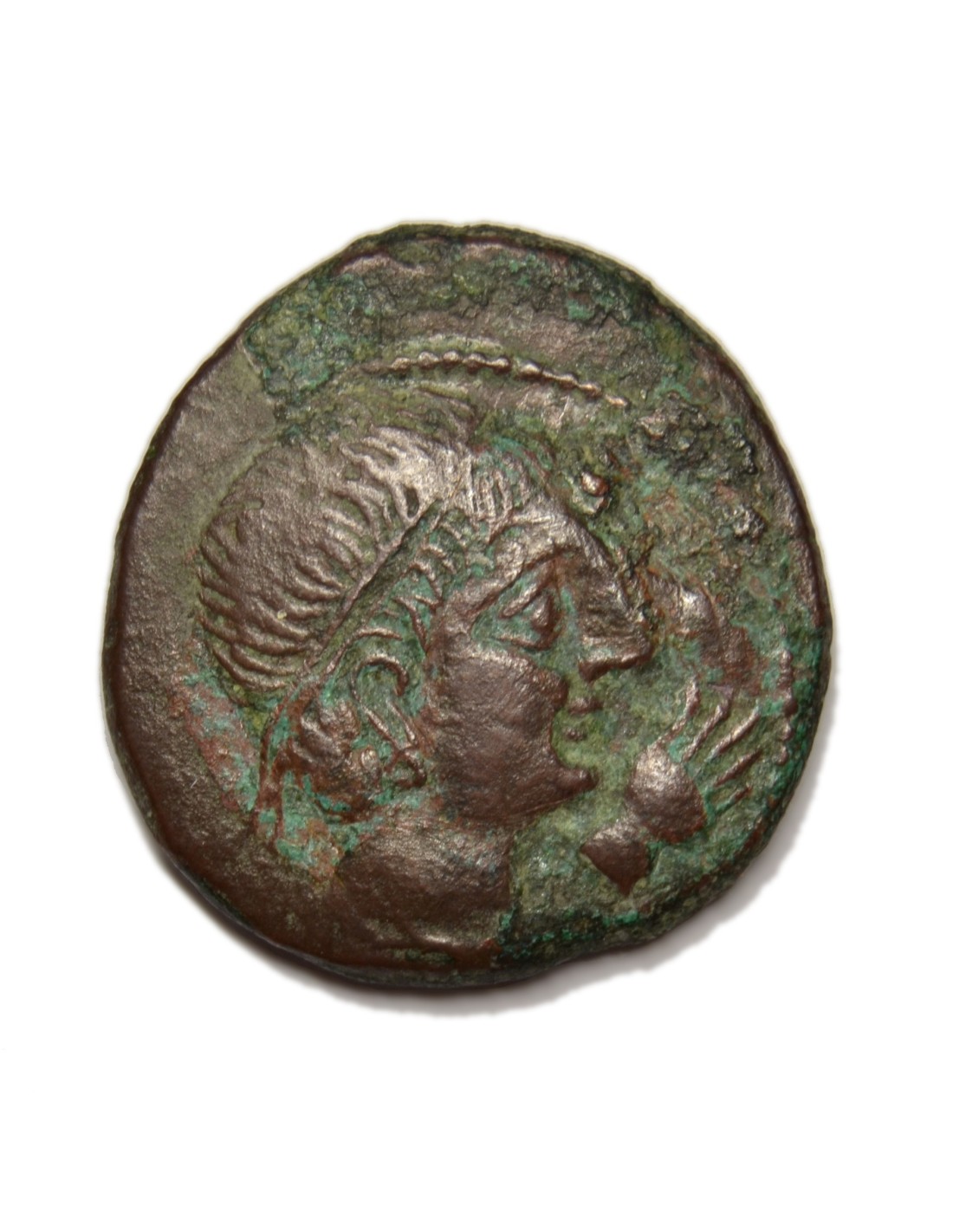 A/ Cabeza viril diademada con ínfulas a derecha, delante mano