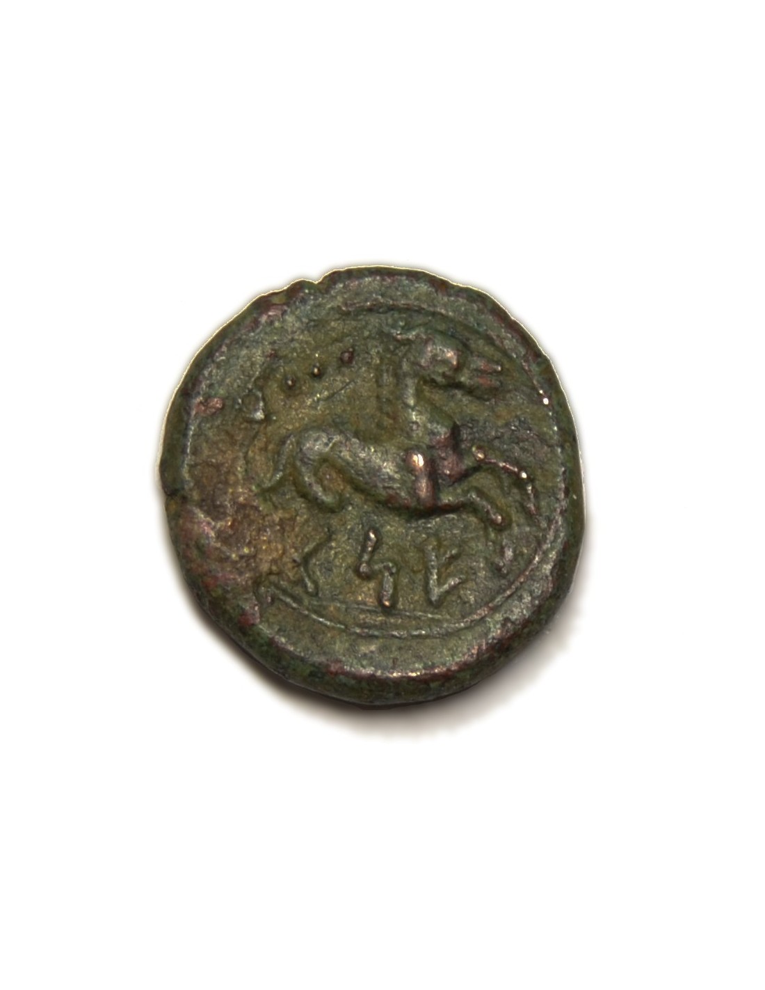 R/ Hipocampo a la derecha, encima tres glóbulos; debajo inscripción ibérica KESE.