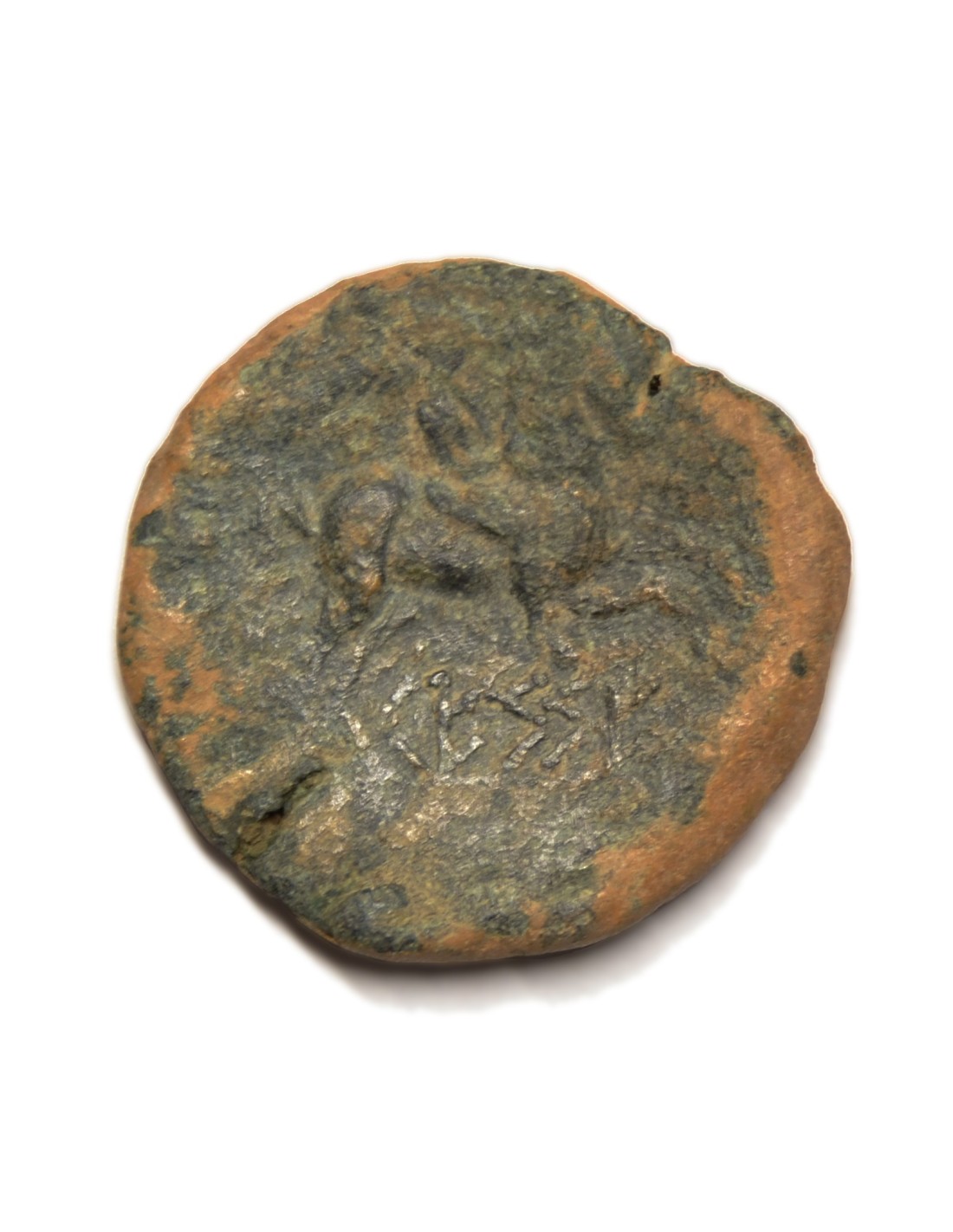 R/ Jinete al trote sujetando palma a la derecha a la derecha; debajo sobre línea inscripción ibérica KESSE.