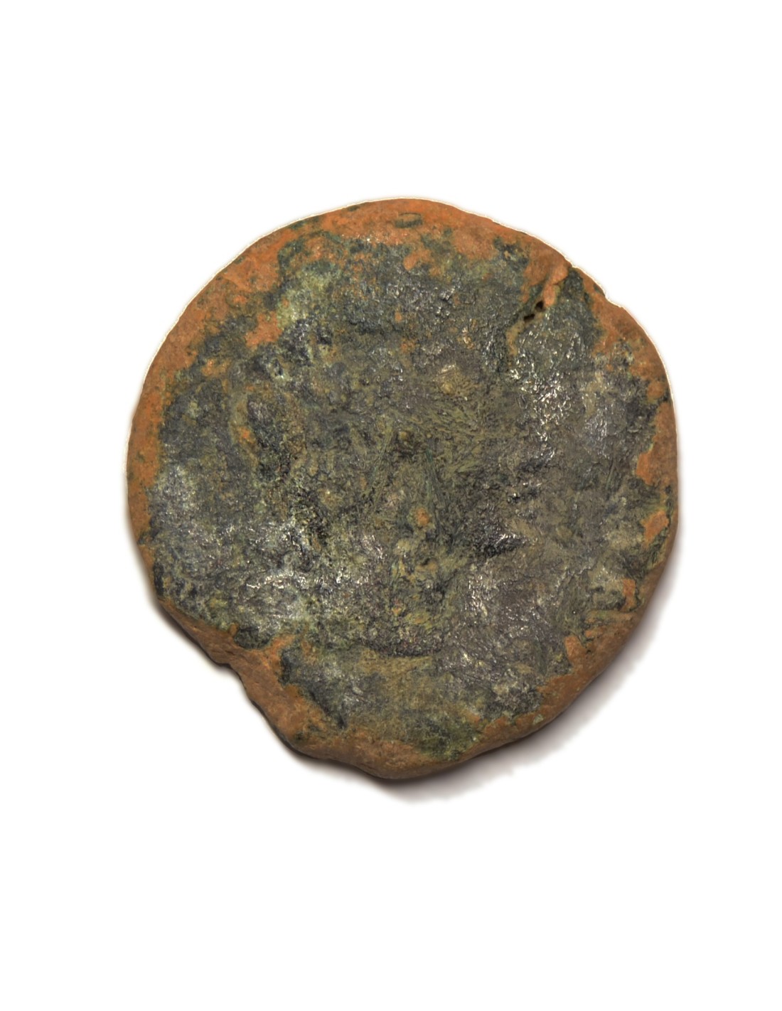 A/ Cabeza masculina a la derecha con capa al cuello y fíbula, detrás signos ibéricos AS (visibles parcialmente).