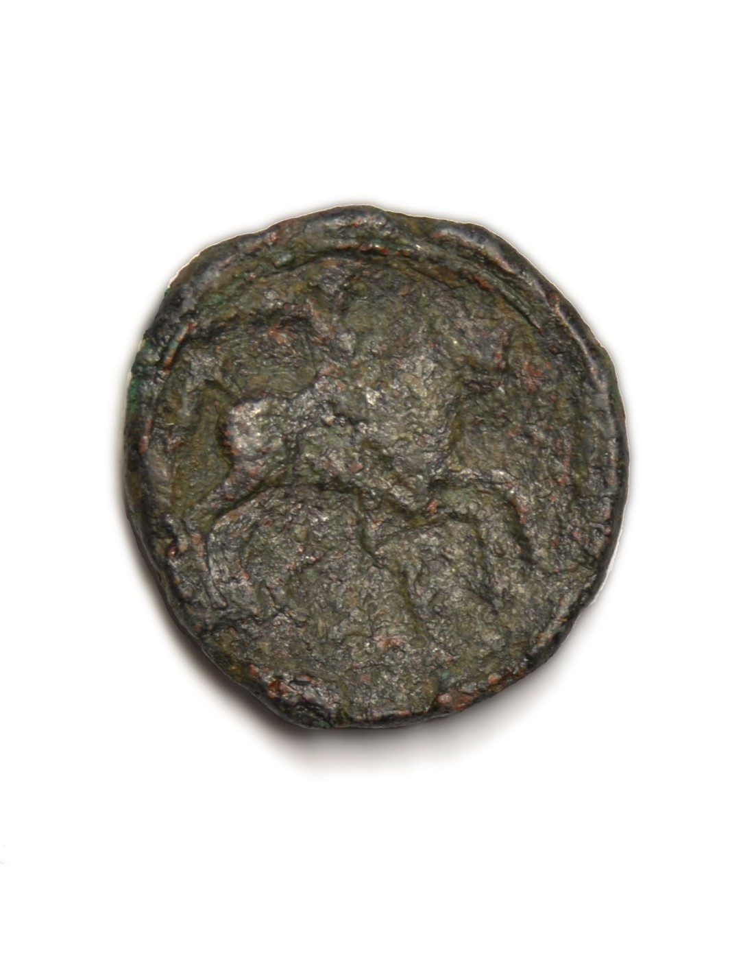 R/ Jinete al trote sujetando palma a la derecha a la derecha; debajo inscripción ibérica KESE.