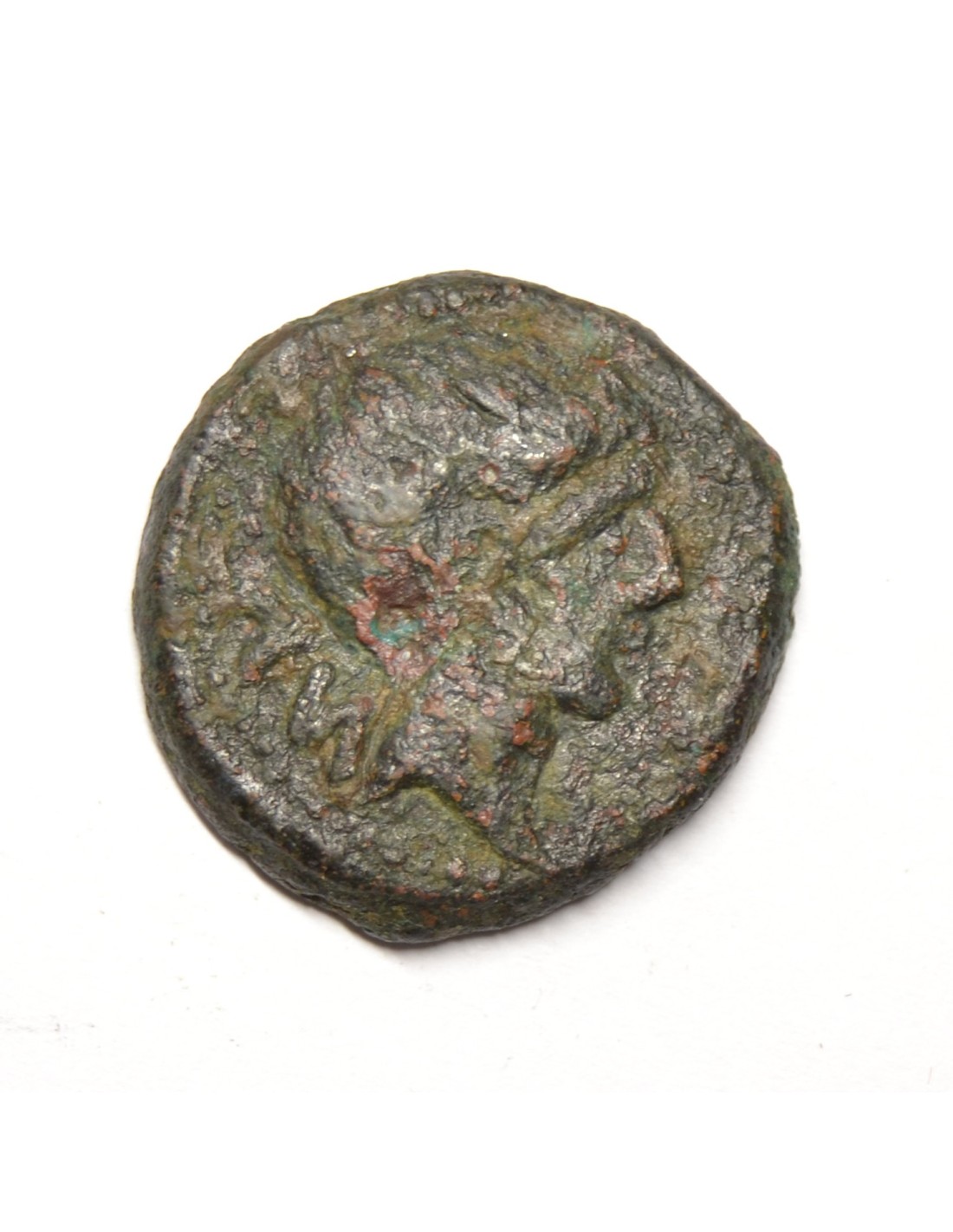 A/ Cabeza masculina a la derecha con collar, detrás signos ibéricos TIKI.